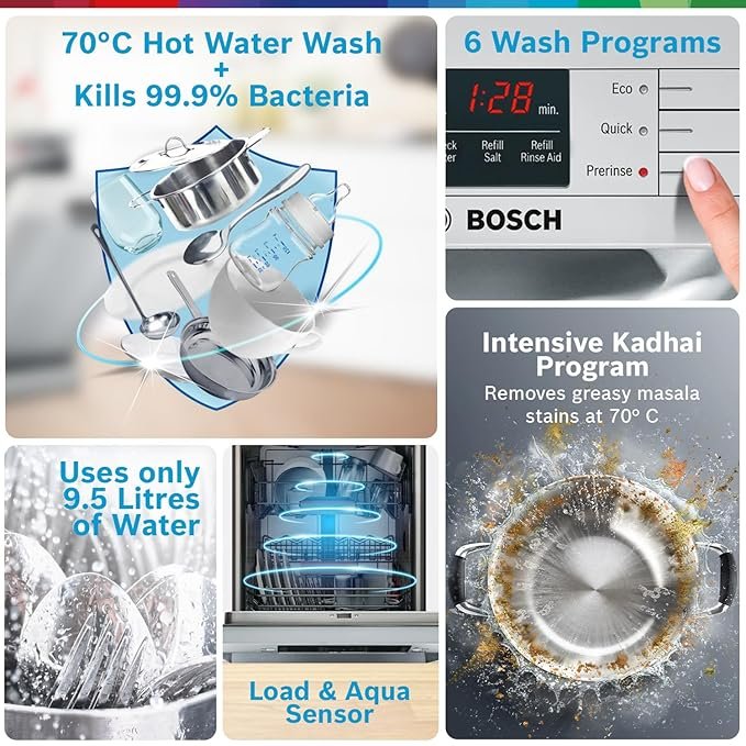 - Wash Programs: 6 Wash Programs – Intensive Kadhai 70°C, Auto 45-65°C, Express Sparkle 65°C, Eco 50°C, Quick 45°C, Pre-rinse